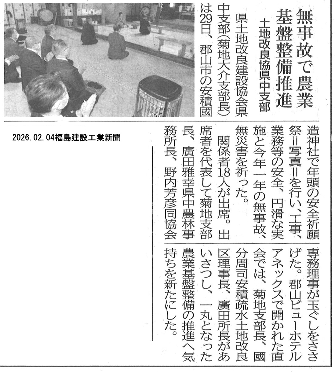 県土地改良建設協会県中支部 安全祈願祭が執り行われました 2026年2月4日 1月29日(木)、安積國造神社にて年頭の安全祈願祭が厳かに執り行われ、当社も会員として参列いたしました。本年の無事故・無災害達成を祈念するとともに、関係各位の皆さまと協力し、安全確保に向けた取り組みを一層推進してまいります。