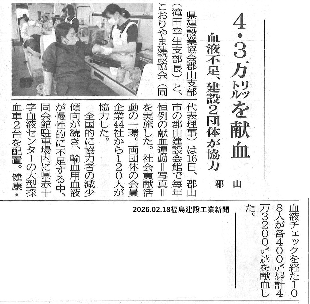 献血活動に参加しました 2026年2月23日 2月16日(月)、福島県建設業協会郡山支部、こおりやま建設協会合同主催の献血活動に参加し、地域医療を支える取り組みに協力いたしました。協会会員各社の皆さまの温かいご支援により、活動の輪が広がりました。今後も地域の皆さまとともに歩む企業として、社会に貢献できる取り組みを続けてまいります。