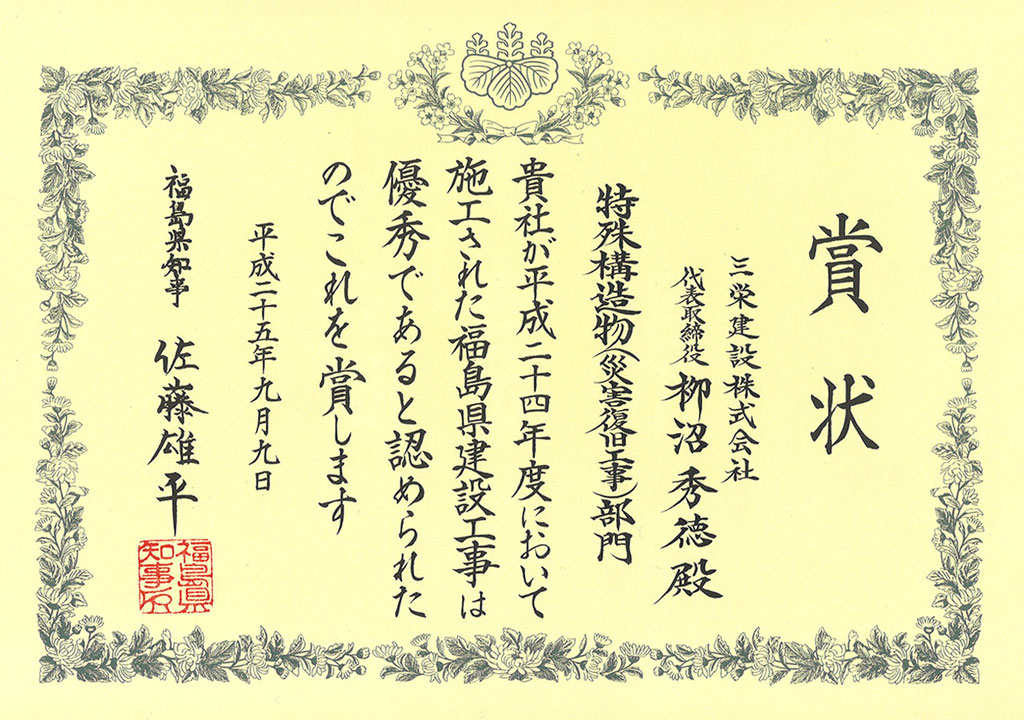 平成24年度福島県優良建設工事受賞